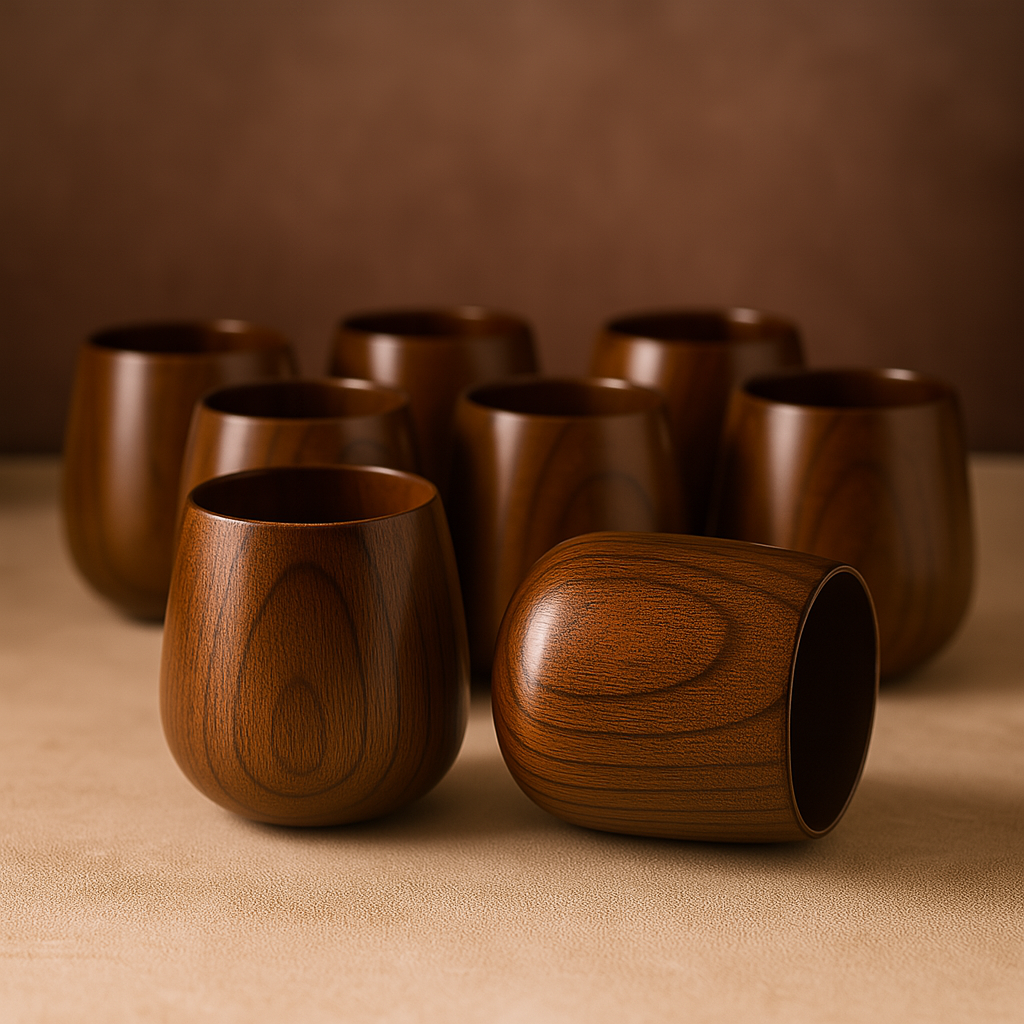 Dieses stilvolle 5er-Set Teebecher aus massivem Holz überzeugt mit japanischer Schlichtheit, natürlicher Ästhetik und angenehmer Haptik. Jeder Becher ist ein Unikat mit schöner Holzmaserung – ideal für Tee, Kaffee, Wein, Bier, Milch oder Wasser.