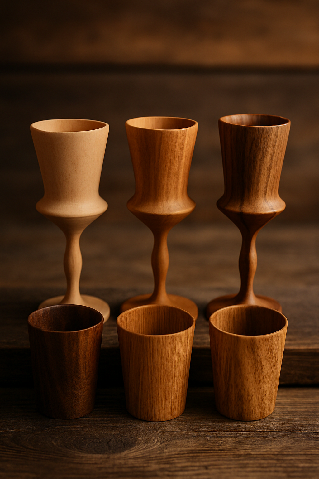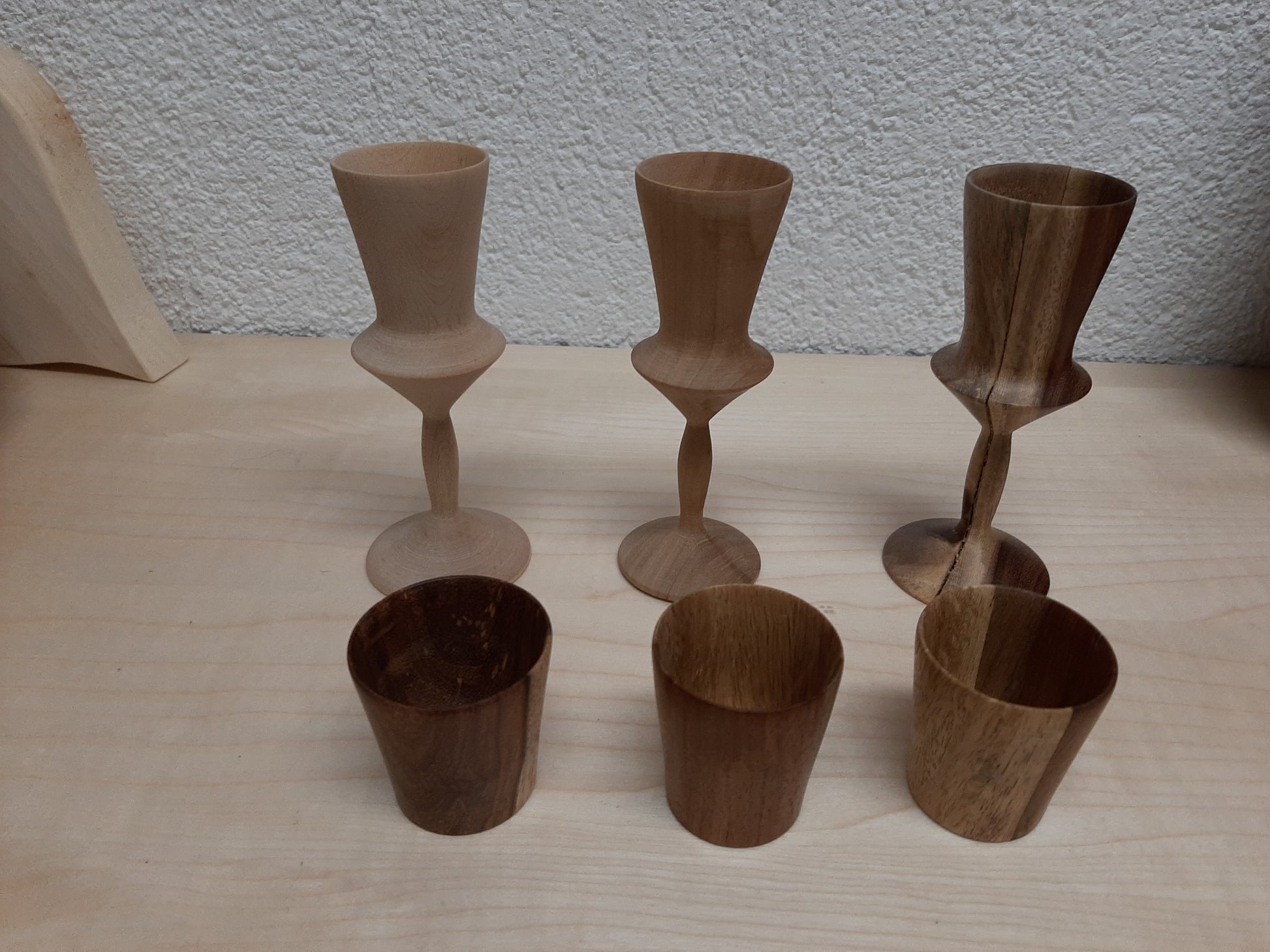 Ein besonderes Set für besondere Momente: Dieses 6-teilige Ensemble besteht aus drei handgedrechselten Liqueur-Gläsern auf elegantem Fuß und drei bauchigen Gläsern – ideal für Schnaps oder feine Liköre. Aus edlen Hölzern gefertigt, liegt jedes Glas angenehm in der Hand und verleiht jedem Anlass eine natürliche Note.