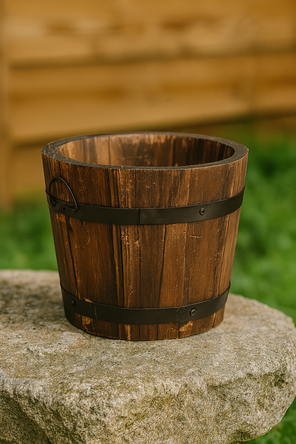 Holzfass-Pflanzgefäß im Vintage-Stil