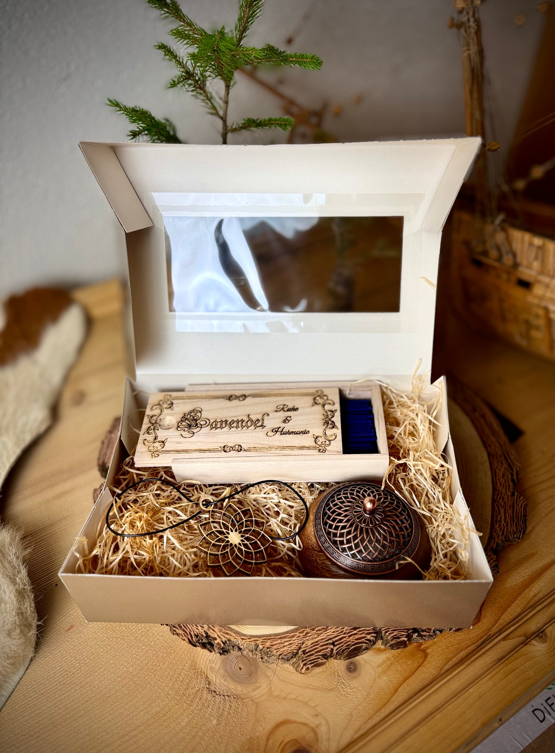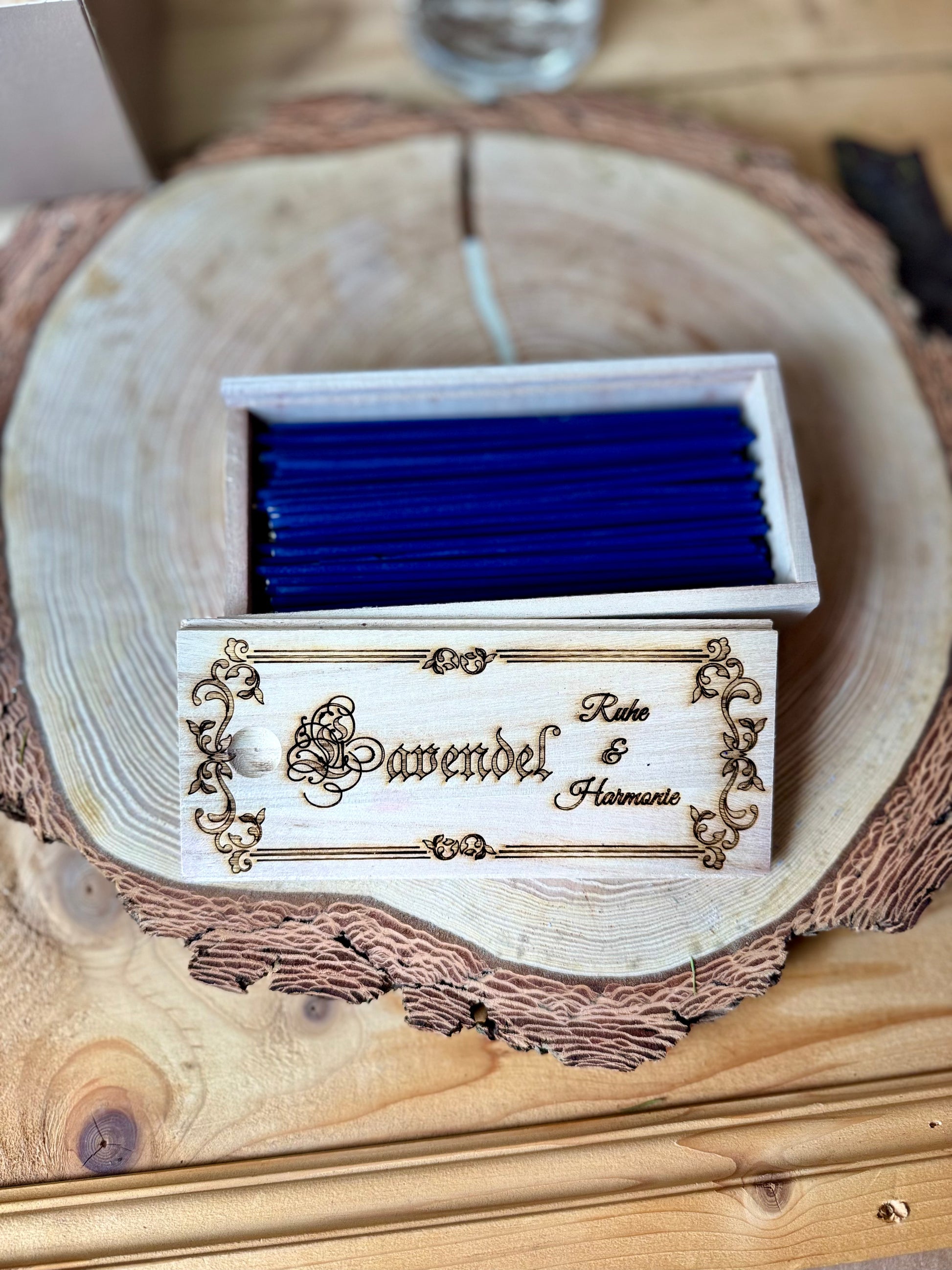 💜 100 lavender incense sticks – stored in an engraved wooden box